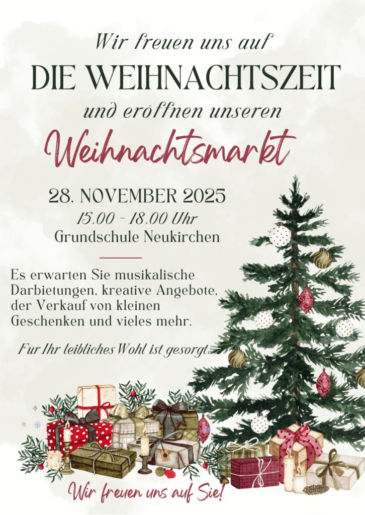 - EinladungSie sind neugierig auf unsere Schule? Dann ist unser traditioneller Weihnachtsmarkt am 28.11.2025 die perfekte Gelegenheit zum Reinschnuppern…