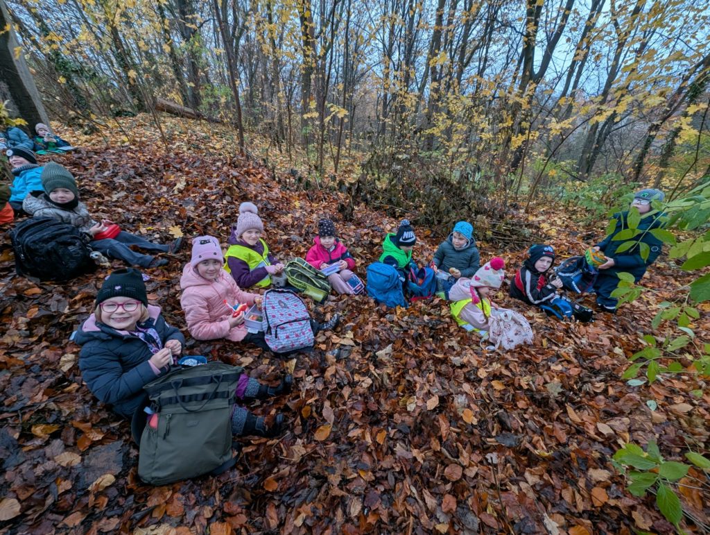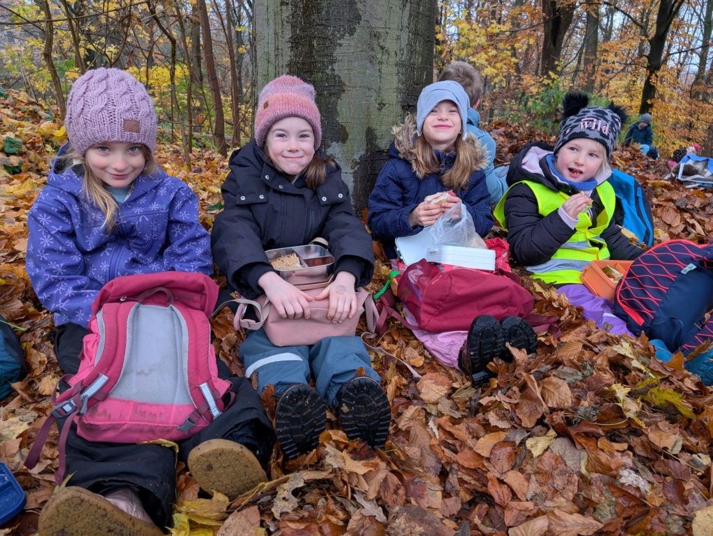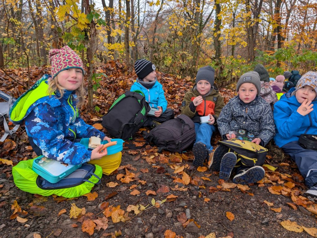Gemeinsam mit Frau Schroeder starteten wir in Zedtlitz mit einem Morgenkreis und einer kleinen Vorstellungsrunde, zu der auch ein kleines Igelchen kam. Nach einer kurzen Strecke frühstückten wir gemütlich (und wie ein echter Igel) im Wald in großen Laubhaufen. Da schmeckte es besonders gut!