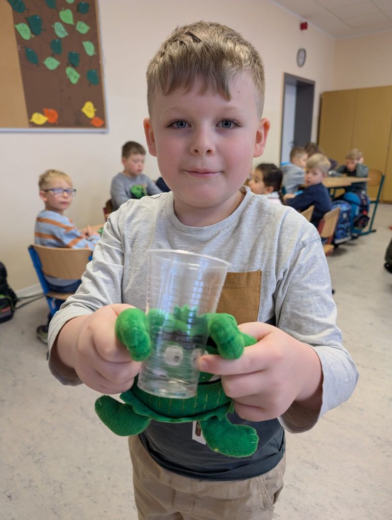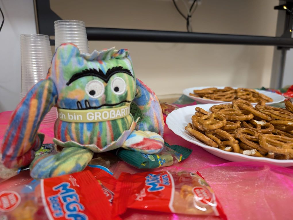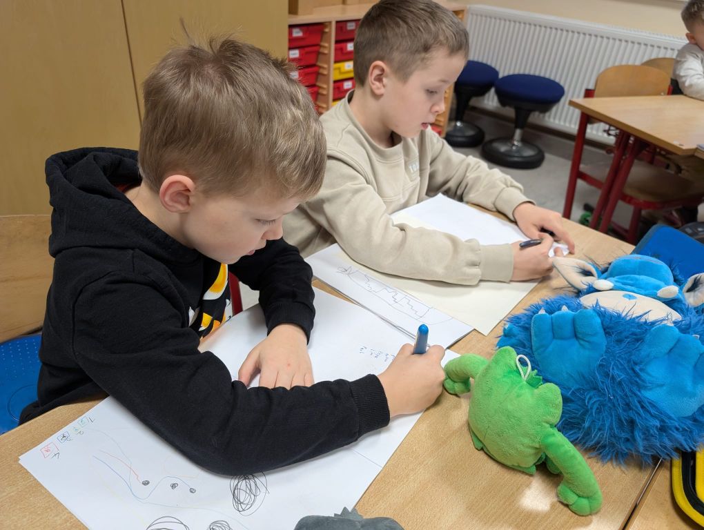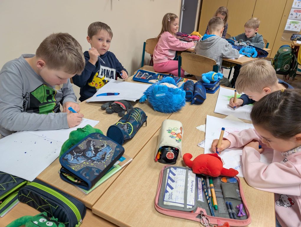 Dazu brachten natürlich auch alle ihre kleinen Monsterchen mit. Von Wusel und Schnarchi über Brabbel und Grinso bis hin zu Zuckerzottel und Hoppsikus waren alle dabei. Monstermäßig! Doch die Monster wollten ja nicht nur Party machen, sondern auch lernen – und da erwischten sie genau den richtigen Tag! Zum allerersten Mal durften die Schülerinnen und Schüler mit dem Füller schreiben. War das aufregend! Im Unter-die-Bank-Heft schrieben sie ihre Namen und einiges anderes und konnten so zeigen, was sie alles lernen.