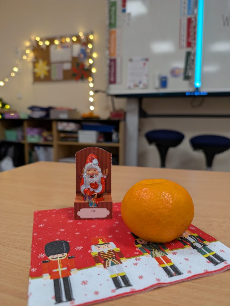 Nach dem täglichen, gemeinsamen Morgenkreis mit Öffnen des Kalendertürchens und dem gemeinsamen Liedersingen, starteten wir in den Schultag. In den Klassenzimmern wartete da bereits eine kleine Überraschung: Denn auch bei uns war der Nikolaus da und brachte jedem Kind Schokolade und eine Mandarine.