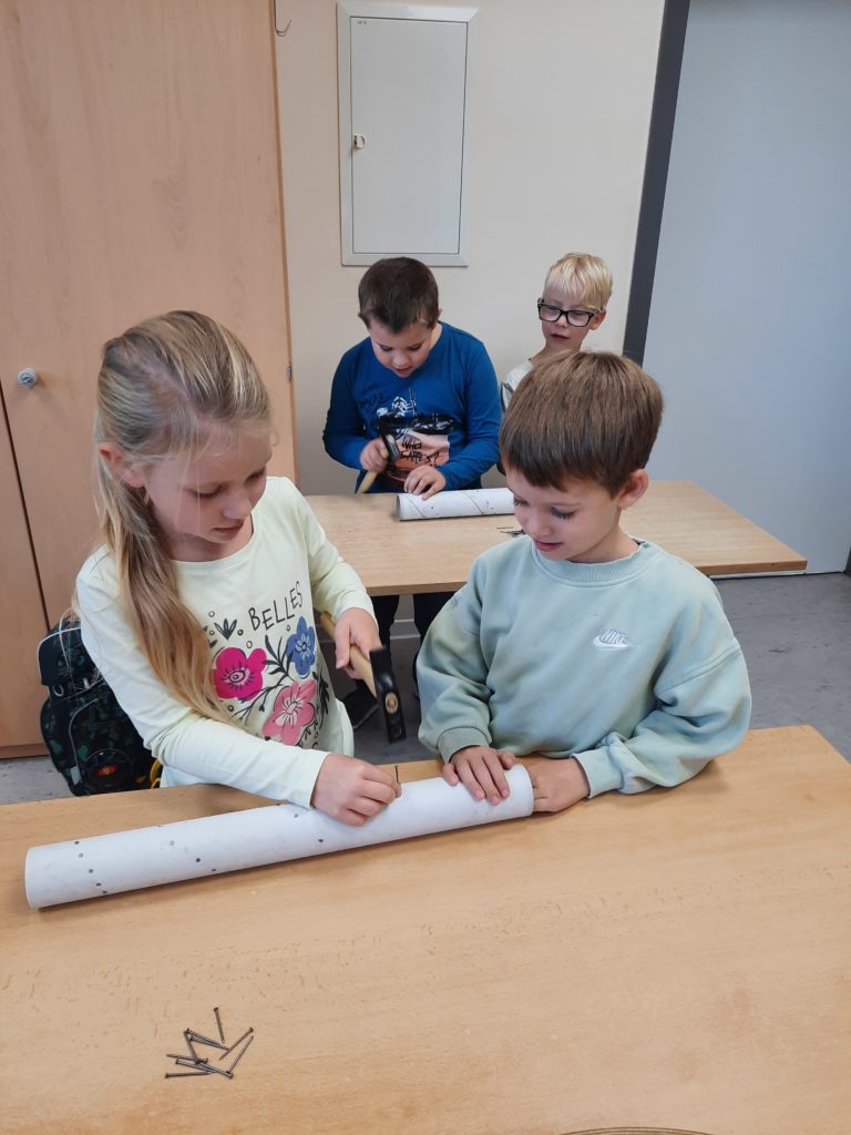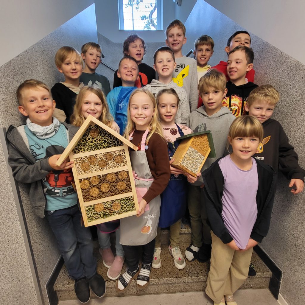 Nach einer spannenden Exkursion zu einem Imker, der viel über Bienen erzählte, bauten die Kinder Insektenhotels, die später im Schulgarten aufgehängt wurden. So helfen wir mit, dass Bienen und Käfer ein Zuhause finden.