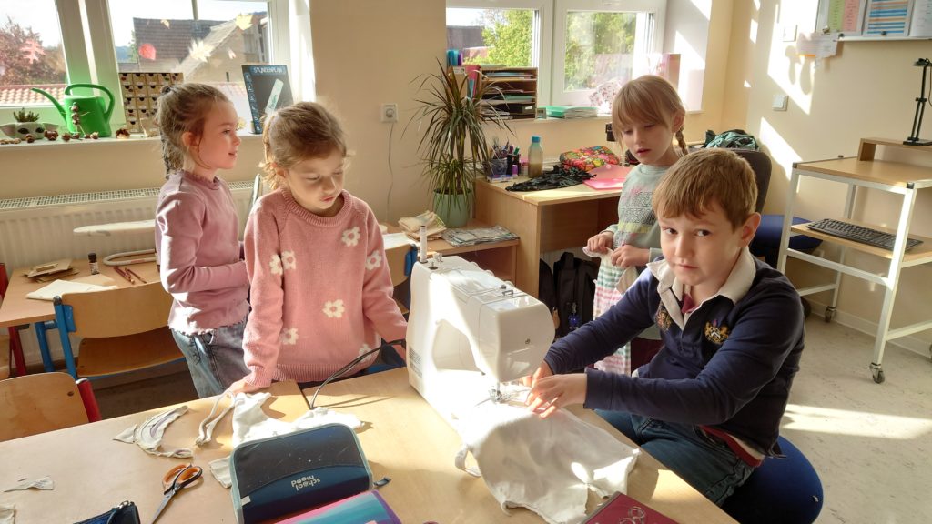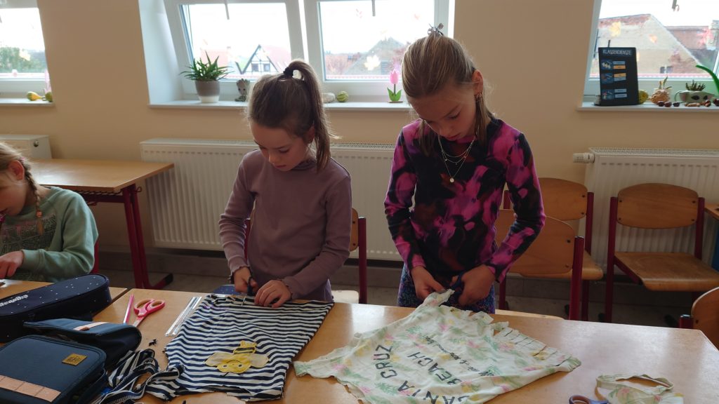 Diese Gruppe hat mit Hilfe von Nadel und Faden eigene Stoffbeutel genäht. So kann man beim Einkaufen auf Plastiktüten verzichten – gut für die Umwelt und sieht toll aus!