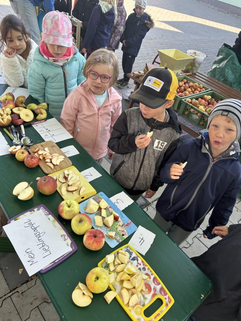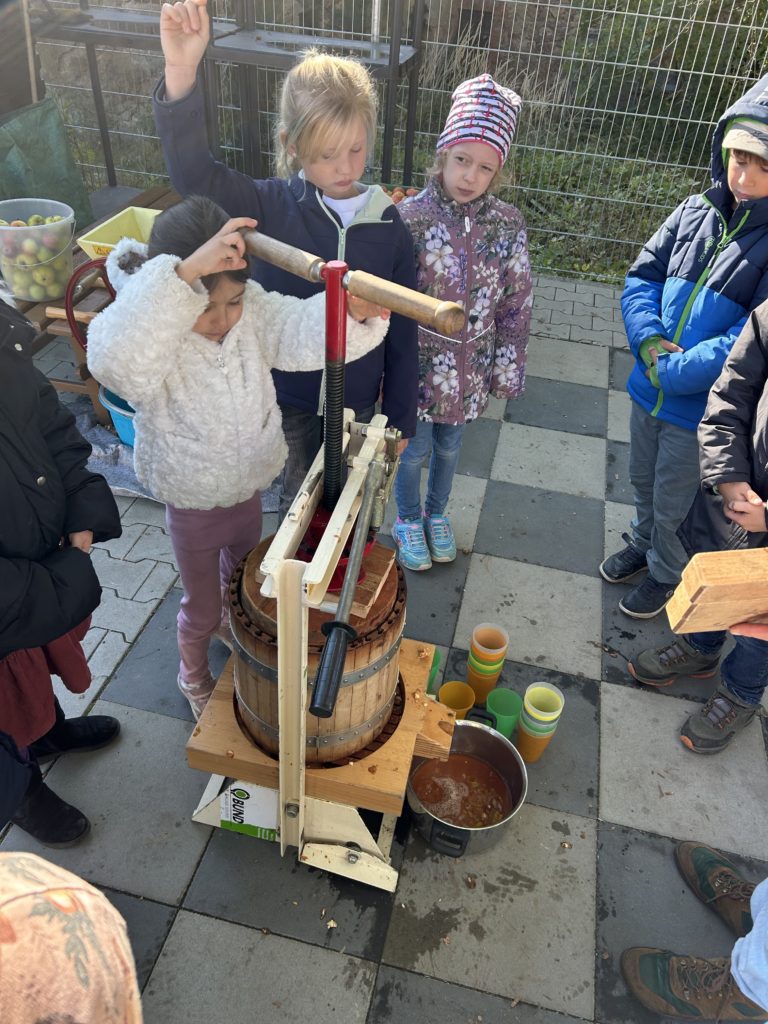 Ein besonderes Erlebnis war das gemeinsame Saftpressen! Viele Eltern brachten frische Äpfel mit in die Schule. Zusammen mit den Kindern wurden sie gewaschen, zerkleinert, gepresst – und natürlich gleich verkostet. Der selbst gemachte Apfelsaft schmeckte herrlich frisch und war ein echtes Highlight der Woche.